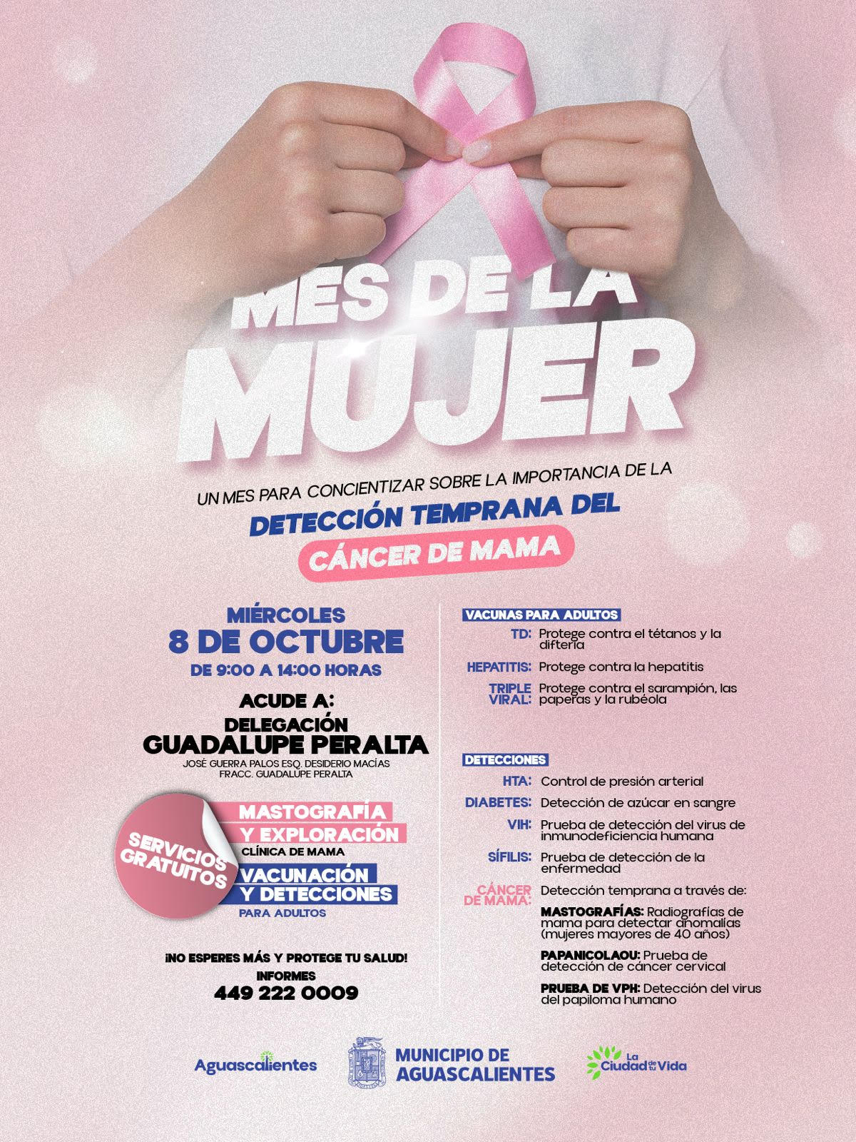 En caso de requerir más información sobre esta feria de la salud, favor de comunicarse a la Delegación Guadalupe Peralta al número 449 222 0009 en un horario de las 8:00 a las 15:30 horas.