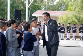 Acompañado de Christian Gutiérrez Márquez, secretario de Desarrollo Social y de Rafael Esqueda Medina, director de este plantel, Leo Montañez hizo entrega de equipo deportivo para fomentar la actividad física de los alumnos de esta primaria.