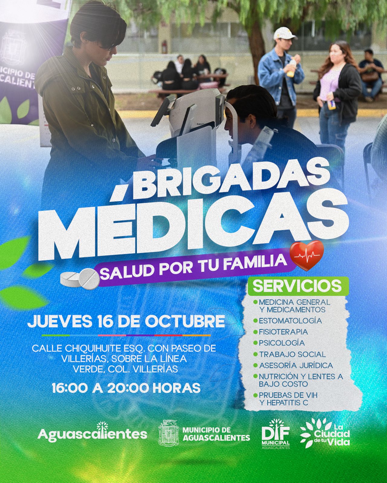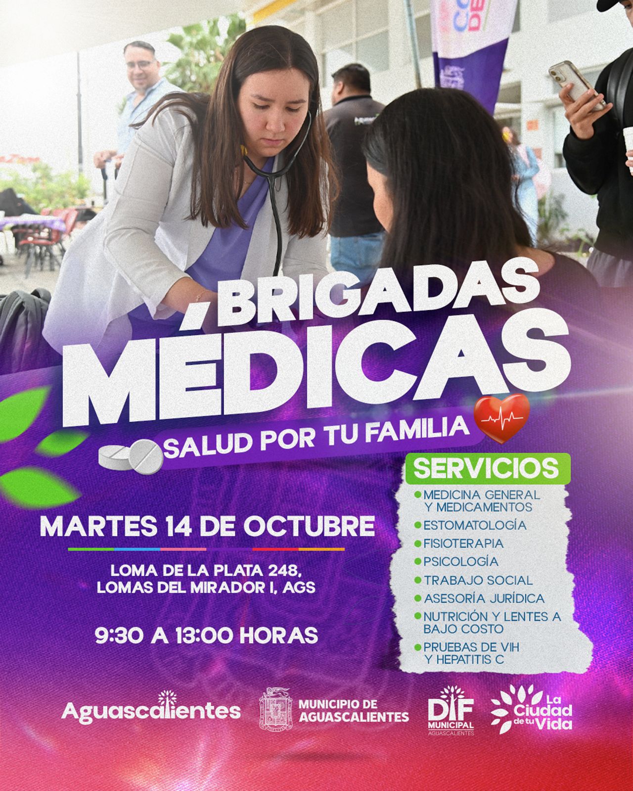 El DIF Municipal de Aguascalientes, en coordinación con la Secretaría de Desarrollo Social y la Coordinación General de Delegaciones Urbanas y Rurales, invita a la ciudadanía a participar en las Brigadas Médicas Gratuitas, con el objetivo de acercar servicios de salud a las familias del municipio.