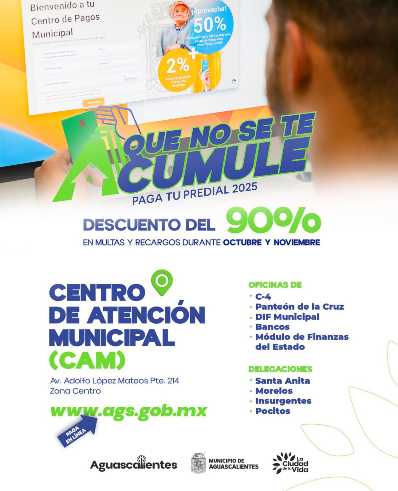 Como una estrategia para incentivar a los contribuyentes a ponerse al corriente en el pago del predial, el Municipio de Aguascalientes, a través de la Secretaría de Finanzas, aplicará el 90 por ciento de descuento en multas y recargos a quienes se acerquen a pagar esta contribución durante los meses de octubre y noviembre.