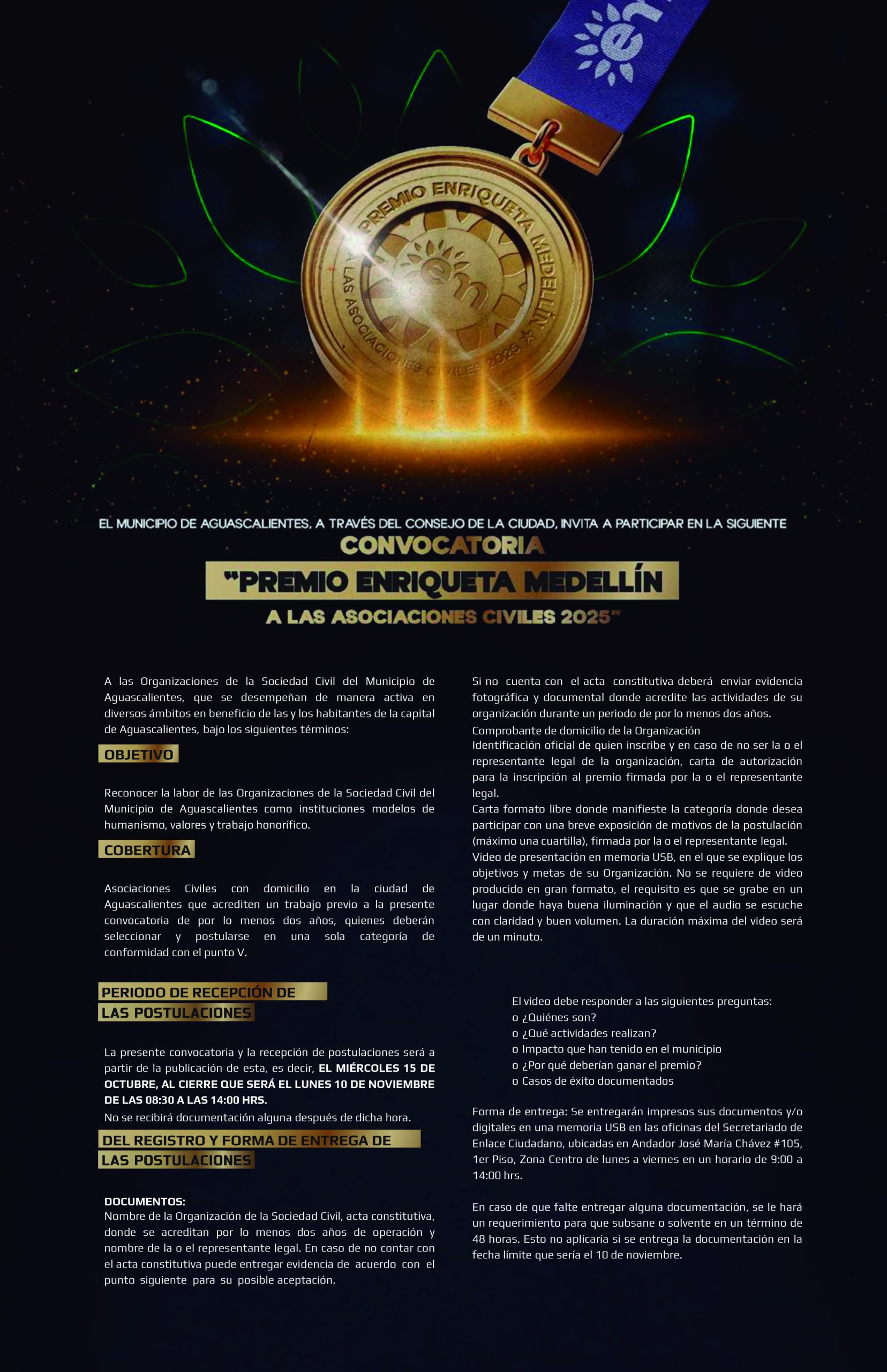 El Municipio de Aguascalientes, a través del Secretariado de Enlace Ciudadano y el Consejo de la Ciudad, presentó la convocatoria para los Premios “Enriqueta Medellín” 2025, que reconocen el trabajo y la aportación de las organizaciones de la sociedad civil al desarrollo del municipio.