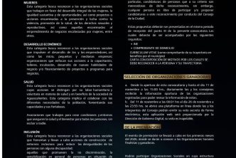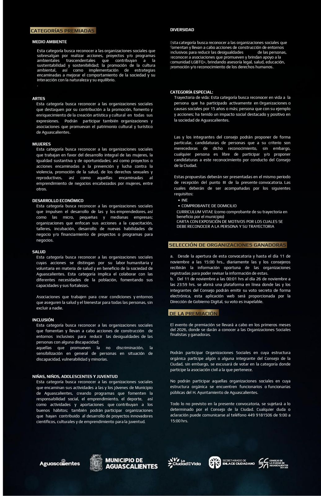 Destacó que este reconocimiento se ha convertido en una plataforma de impulso y fortalecimiento para las organizaciones sociales del municipio y quienes deseen participar deberán entregar la documentación impresa o en memoria USB en las oficinas del Secretariado de Enlace Ciudadano en Andador José María Chávez 105 primer piso, Zona Centro, de lunes a viernes, de 9:00 a 14:00 horas, y para mayores informes está disponible el teléfono 449 918 15 06.