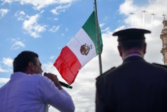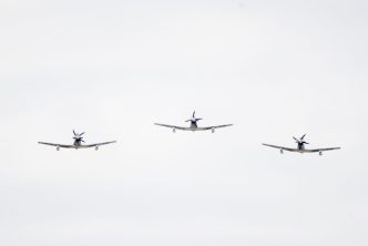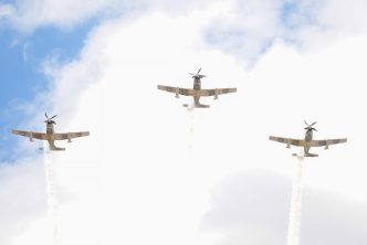 Tres aviones Texan T-6C de la Fuerza Aérea Mexicana surcaron el cielo con tres vuelos en formación que miles de personas presenciaron desde la exedra de la Plaza de la Patria en el Centro Histórico.