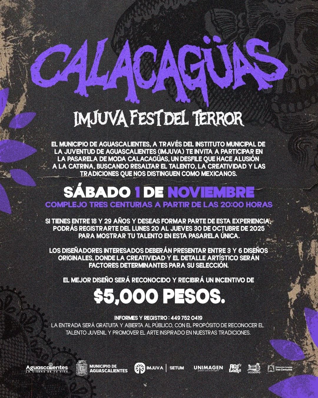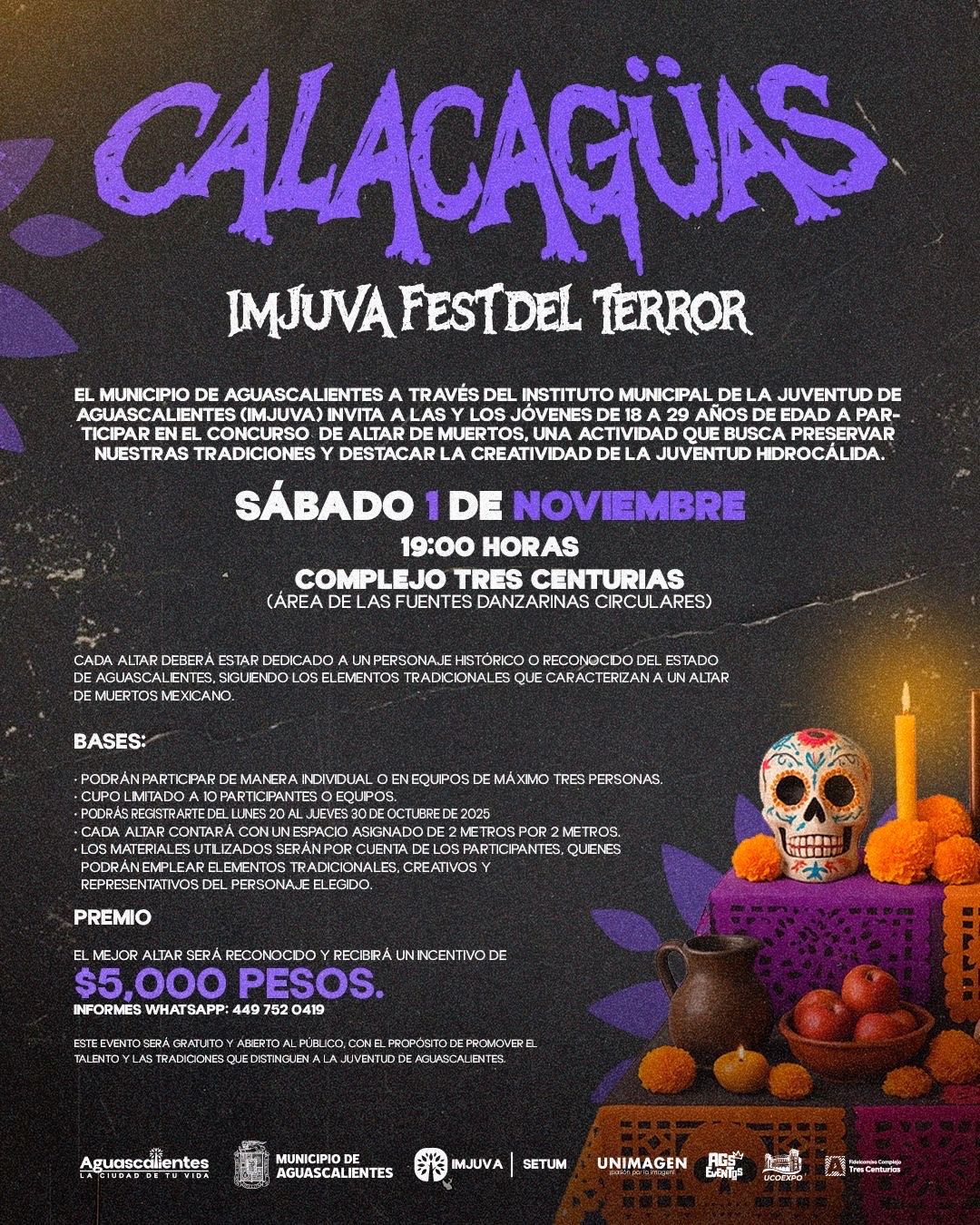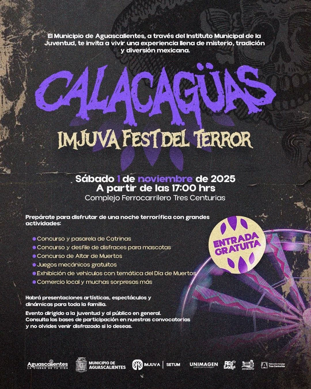 El Instituto Municipal de la Juventud (Imjuva), invita a la ciudadanía al magno evento “Calacagüas, Imjuva Fest del Terror”, que se llevará a cabo el 1 de noviembre de 2025 en el Complejo Ferrocarrilero Tres Centurias, a partir de las 17:00 horas. Este gran evento estará abierto al público en general en donde podrán disfrutar de una noche llena de diversión, talento juvenil y tradiciones mexicanas que evocan la vida y la muerte.