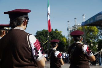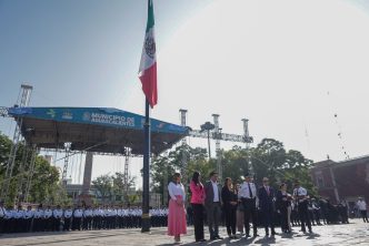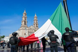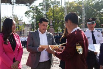 Acompañado por los regidores del H. Ayuntamiento de Aguascalientes y por el titular de la Secretaría de Seguridad Pública del Municipio (SSPM), Gonzalo Pérez Zúñiga, el presidente municipal rindió honores al lábaro patrio en la Plaza Principal, para resaltar los valores cívicos y la proximidad social.