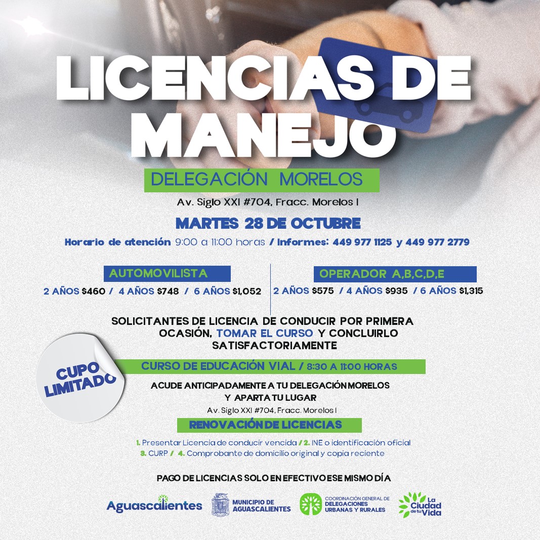 Este próximo martes 28 de octubre se llevará a cabo una nueva jornada de renovación de licencias de manejo en el Fraccionamiento Morelos I como parte de la estrategia del Municipio de Aguascalientes y Gobierno del Estado para que los ciudadanos puedan realizar trámites cerca de su domicilio o lugar de trabajo.