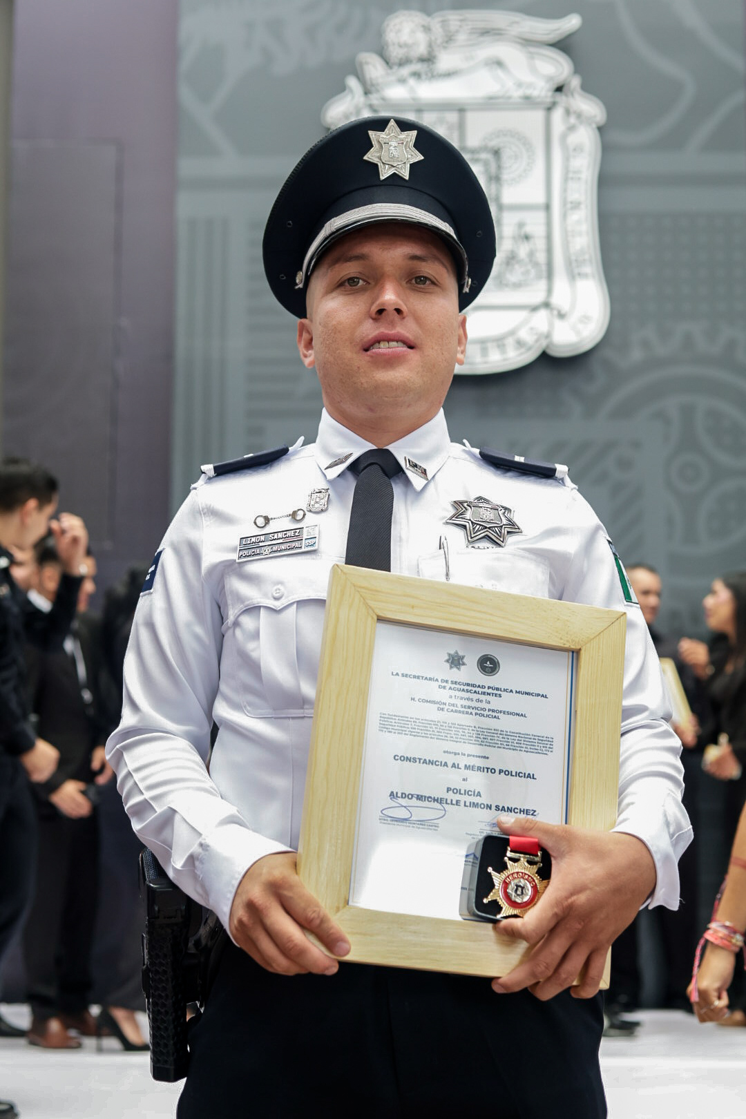 Durante la ceremonia realizada en Palacio Municipal, 12 elementos de la Policía Municipal fueron galardonados en distintas categorías, como Mérito Policial, Mérito Ejemplar, Mérito Académico, Mérito Tecnológico, Mérito Docente y Mérito Deportivo, las cuales distinguen la entrega, la vocación y el compromiso con la seguridad de las familias de Aguascalientes.