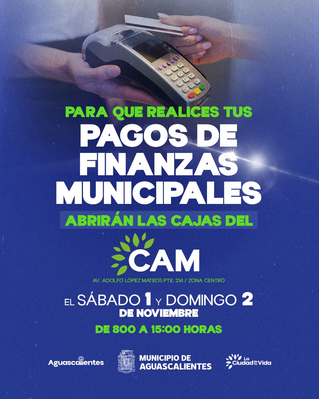 El Municipio de Aguascalientes, a través de la Secretaría de Finanzas, anuncio la apertura de las cajas del Centro de Atención Municipal (CAM) los próximos días sábado 1 y domingo 2 de noviembre, para recibir los pagos de servicios municipales como el predial.