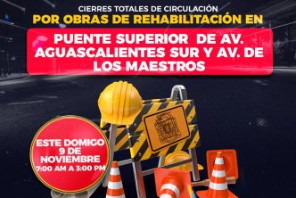 El Municipio de Aguascalientes, a través de la Secretaría de Obras Públicas, informa a la ciudadanía que este domingo 9 de noviembre, en un horario de 7:00 de la mañana a 3:00 de la tarde, se llevarán a cabo trabajos de mantenimiento vial en el puente superior ubicado en la intersección de Avenida Aguascalientes Sur y Avenida de los Maestros.
