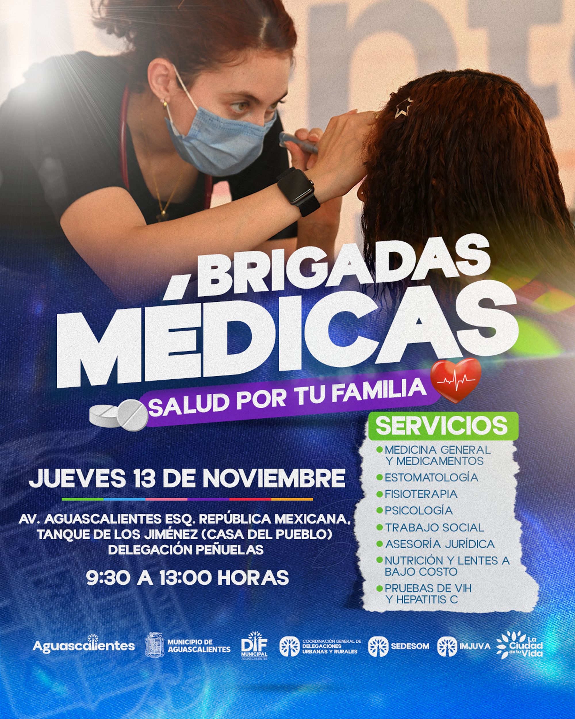 Jueves 13 de noviembre. Av. Aguascalientes esquina con República Mexicana, Tanque de los Jiménez (Casa del Pueblo), Delegación Peñuelas, de 9:30 a 13:00 horas.