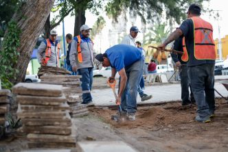 Como parte de las acciones para mejorar la imagen urbana y hacer más agradables los espacios públicos, la Secretaría de Obras Públicas Municipales (SOPMA) realiza trabajos de rehabilitación en los andadores de los estadios Victoria y Alberto Romo Chávez, donde se retira el piso dañado por raíces de árboles.