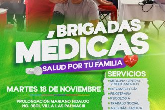 El DIF Municipal de Aguascalientes invita a las y los ciudadanos a participar en la próxima Brigada Médica Gratuita, que se llevará a cabo el martes 18 de noviembre, de 9:30 a 13:00 horas, en Prolongación Mariano Hidalgo No. 3801, fraccionamiento Villa Las Palmas III.