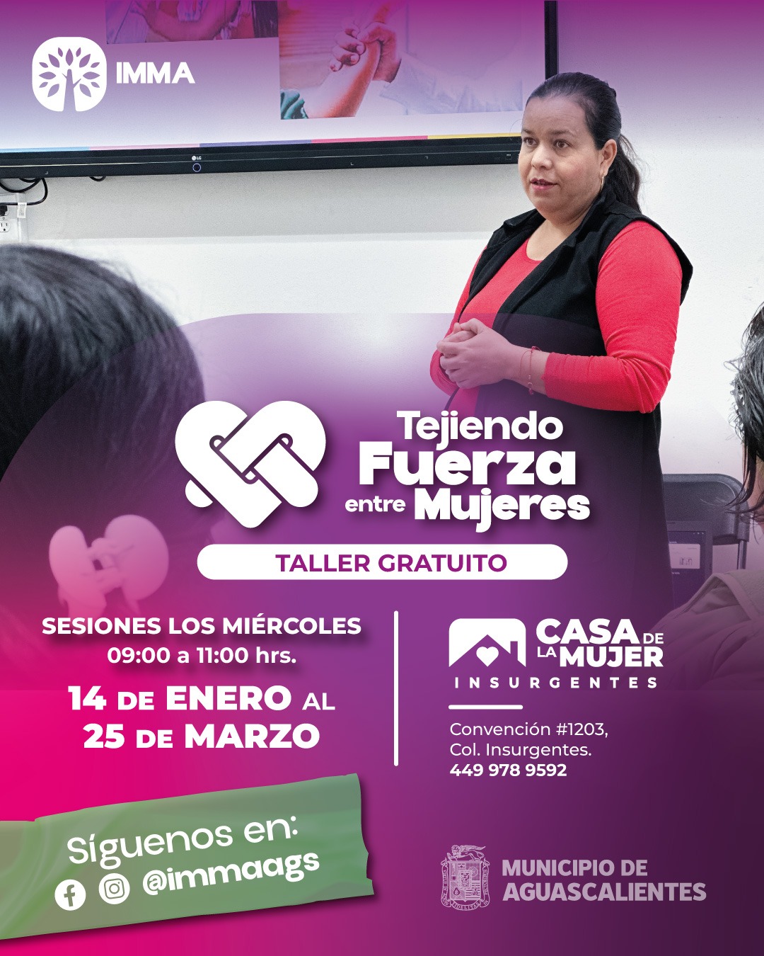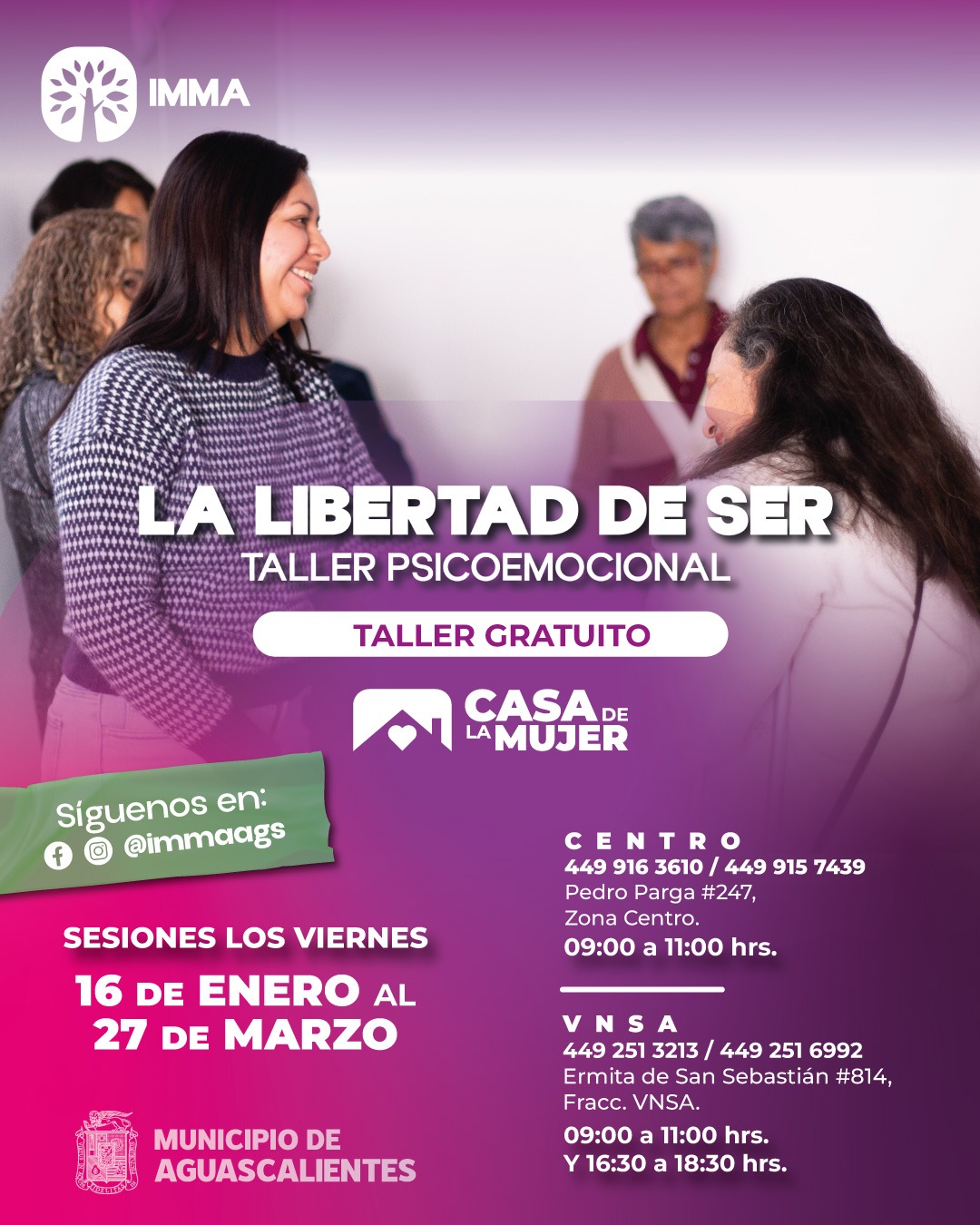 Con el objetivo de continuar promoviendo el bienestar integral de las mujeres, el Instituto Municipal de la Mujer de Aguascalientes (IMMA) dará inicio a una nueva serie de cursos y talleres psicoemocionales que se impartirán en las distintas Casas de la Mujer del municipio, como parte de las acciones permanentes de atención, acompañamiento y fortalecimiento emocional.