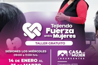 De igual forma, en la Casa de la Mujer Insurgentes se impartirá este mismo taller bajo el título “Tejiendo Fuerzas entre Mujeres”, el cual se llevará a cabo todos los miércoles, del 14 de enero al 25 de marzo del presente año, en un horario de 10:00 a 12:00 horas, en las instalaciones ubicadas en Av. Circunvalación 1203, colonia Insurgentes.