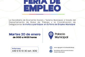 Con el objetivo de seguir impulsando el empleo formal y fortalecer la economía local, el Municipio de Aguascalientes, a través de la Secretaría de Economía Social y Turismo Municipal (Setum), llevará a cabo la Primera Feria de Empleo Municipal de este 2026, el próximo martes 20 de enero, en Palacio Municipal, en un horario de 9:00 a 14:00 horas.