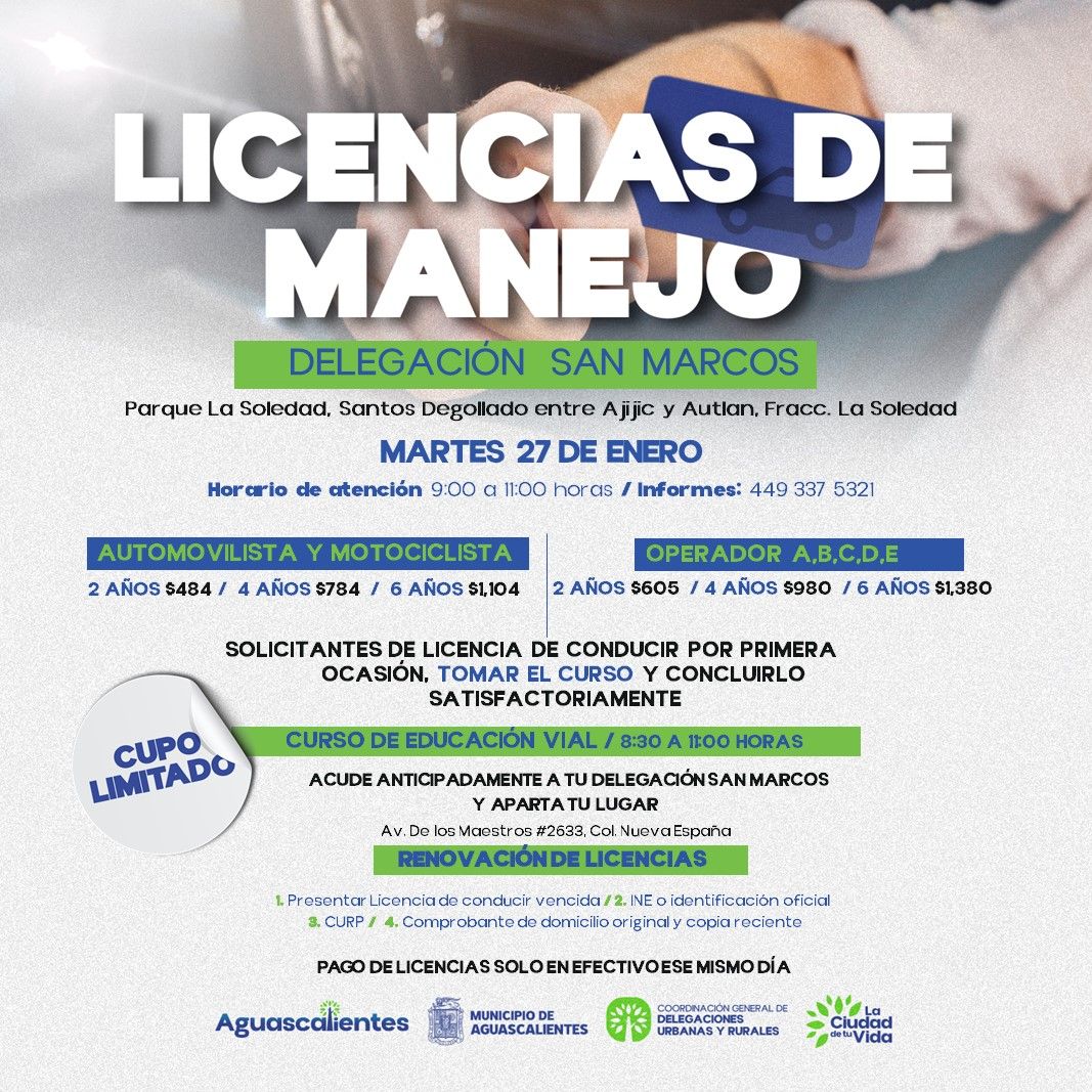 Este próximo martes 27 de enero se llevará a cabo una nueva jornada de renovación de licencias; la Coordinación General de Delegaciones Urbanas y Rurales informó que los interesados podrán acudir al Parque La Soledad, ubicado en el fraccionamiento La Soledad, en calles Santos Degollado, de las 9:00 a las 11:00 horas.