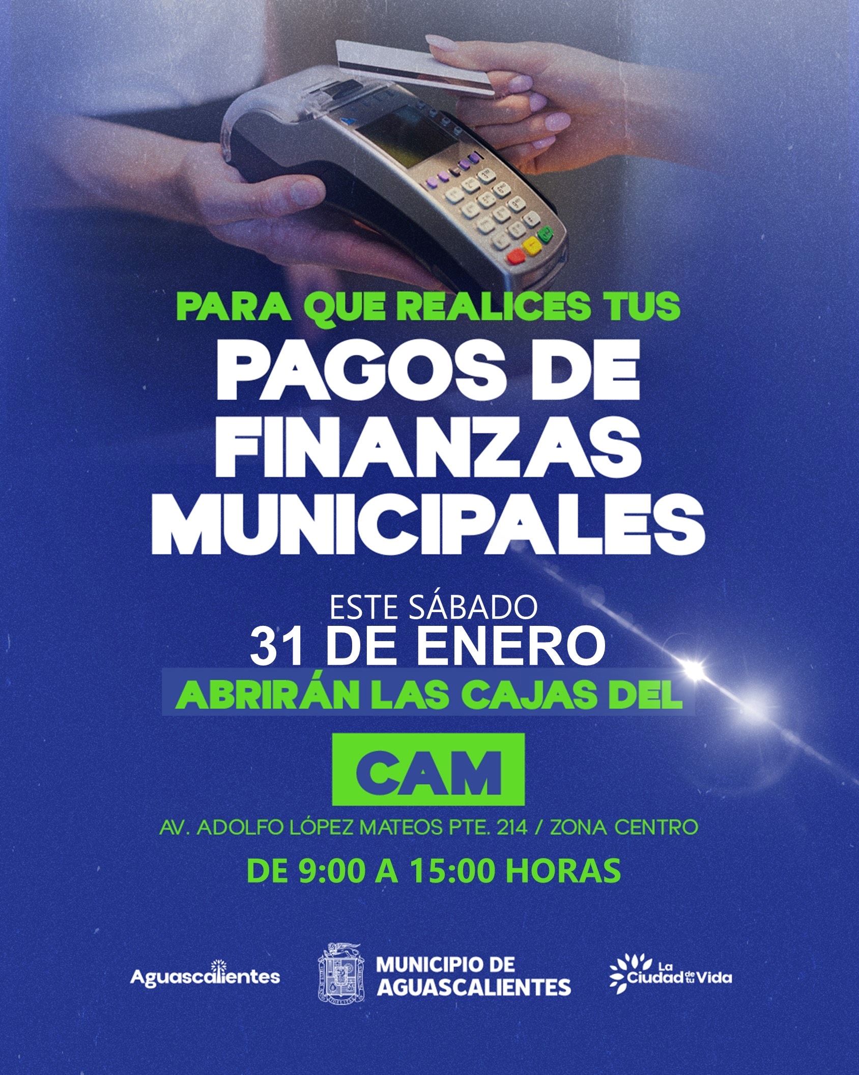 La secretaría de Finanzas del Municipio de Aguascalientes, Miriam Rodríguez Tiscareño, dio a conocer que el próximo sábado 31 de enero el Centro de Atención Municipal (CAM) brindará servicio al público para la recepción de pagos del impuesto predial.