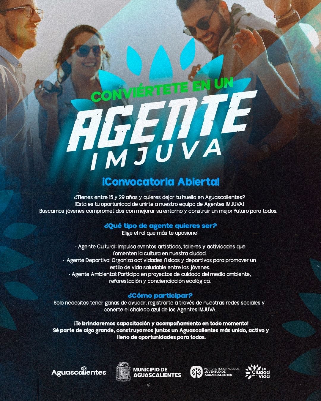 El Municipio de Aguascalientes, a través del Instituto Municipal de la Juventud (IMJUVA), invita a las y los jóvenes a formar parte del programa Agente IMJUVA, una iniciativa creada para quienes desean dejar un impacto positivo en la sociedad e integrar a jóvenes comprometidos, con vocación social, que aporten acciones, talento y energía al desarrollo del municipio.