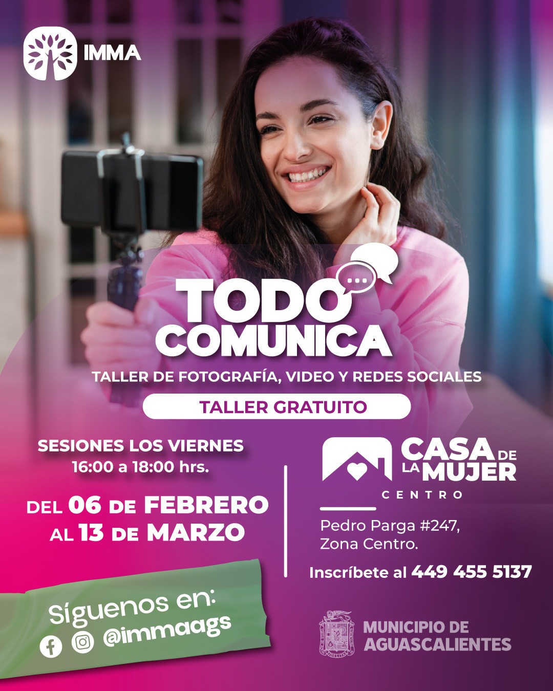 El Instituto Municipal de la Mujer de Aguascalientes (IMMA), llevará a cabo el primer Taller de Fotografía, Video y Redes Sociales, denominado «Todo Comunica», una iniciativa dirigida a mujeres emprendedoras que buscan fortalecer sus proyectos mediante el uso estratégico de la comunicación visual, como una herramienta clave para el crecimiento y consolidación de sus negocios.