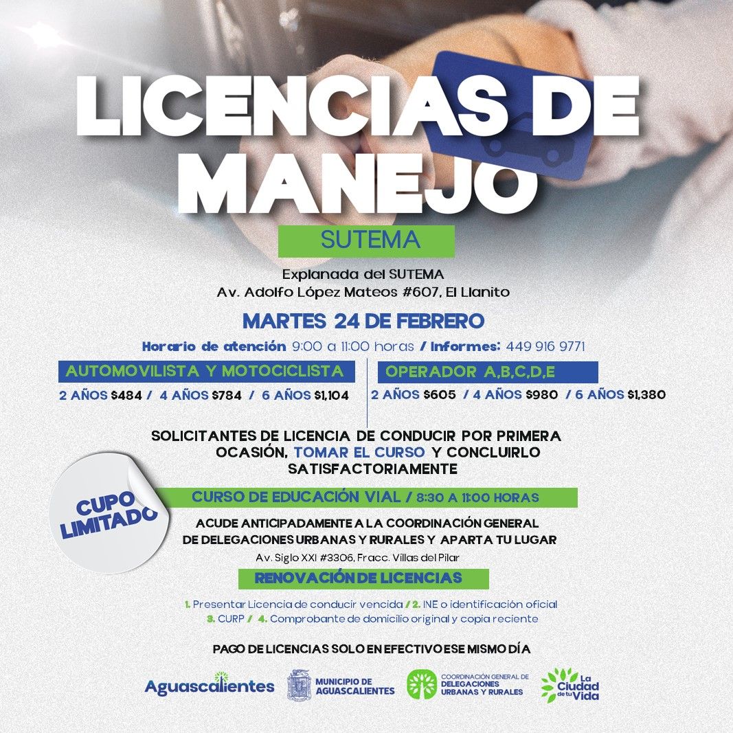 El martes 24 de febrero de 2026 se llevará a cabo una nueva jornada de renovación de licencias de manejo para motociclista, automovilista y operador tipo A, B, C, D y E, cuya sede será la Explanada del Sindicato Único de Trabajadores Estatales y Municipales de Aguascalientes (SUTEMA) ubicada en la Av. Adolfo López Mateos #607 en El Llanito.