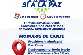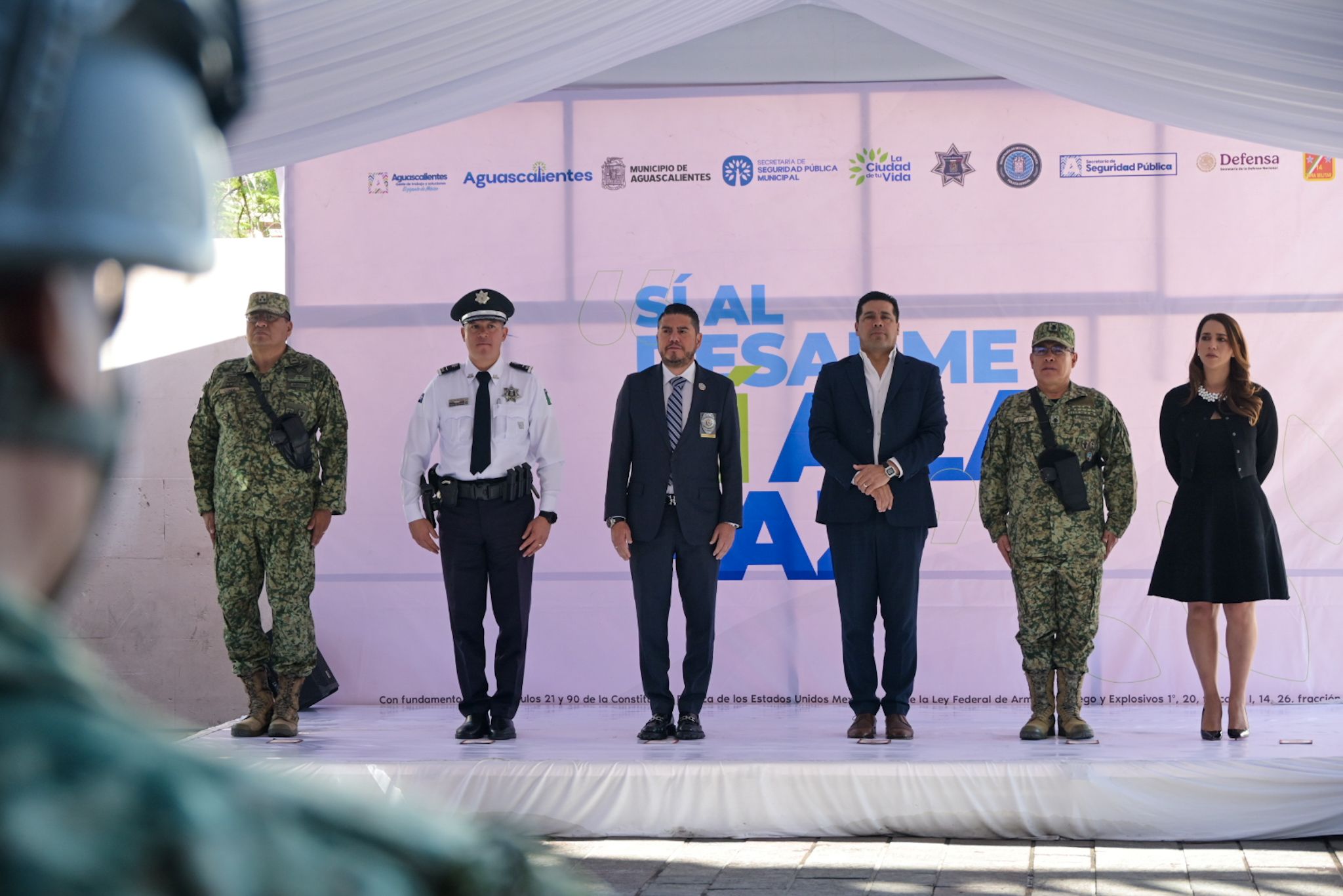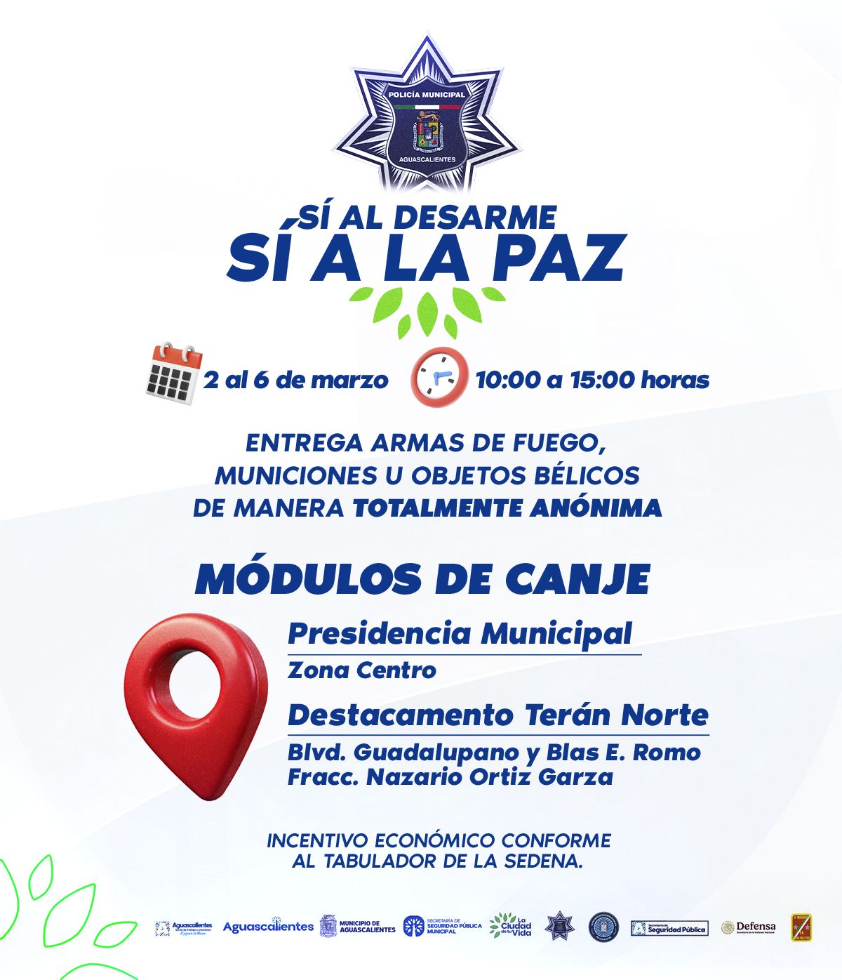 Como parte de la conjunción de esfuerzos para preservar en Aguascalientes la seguridad y tranquilidad de la ciudadanía, el presidente municipal Leo Montañez llamó a participar en la campaña de canje de armas de fuego 2026 «Sí al desarme, sí a la paz» que se lleva a cabo en coordinación con la Secretaría de la Defensa Nacional (Sedena).