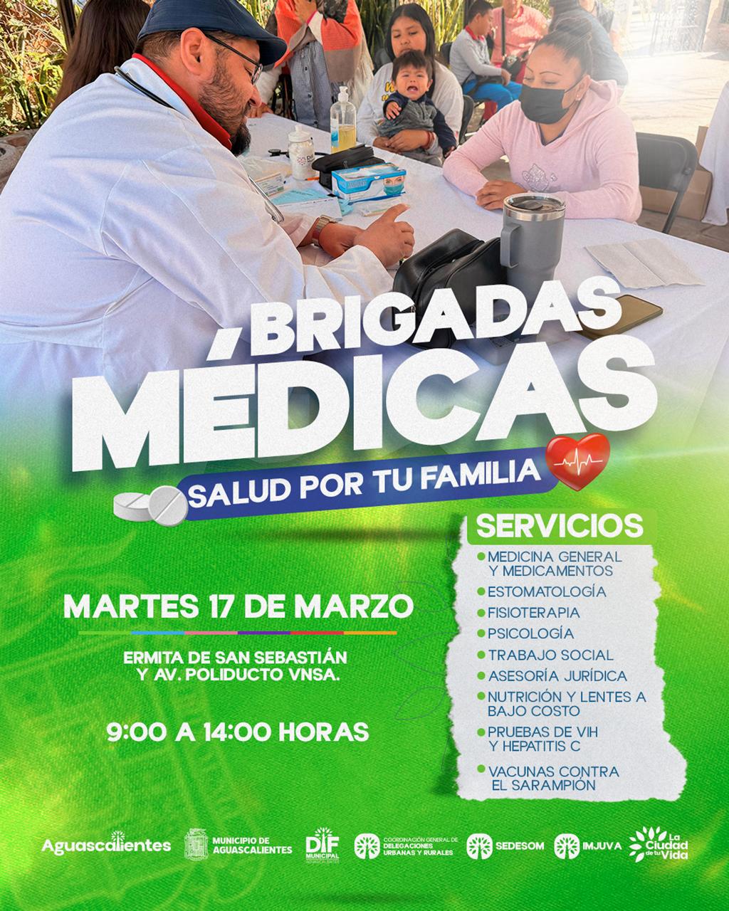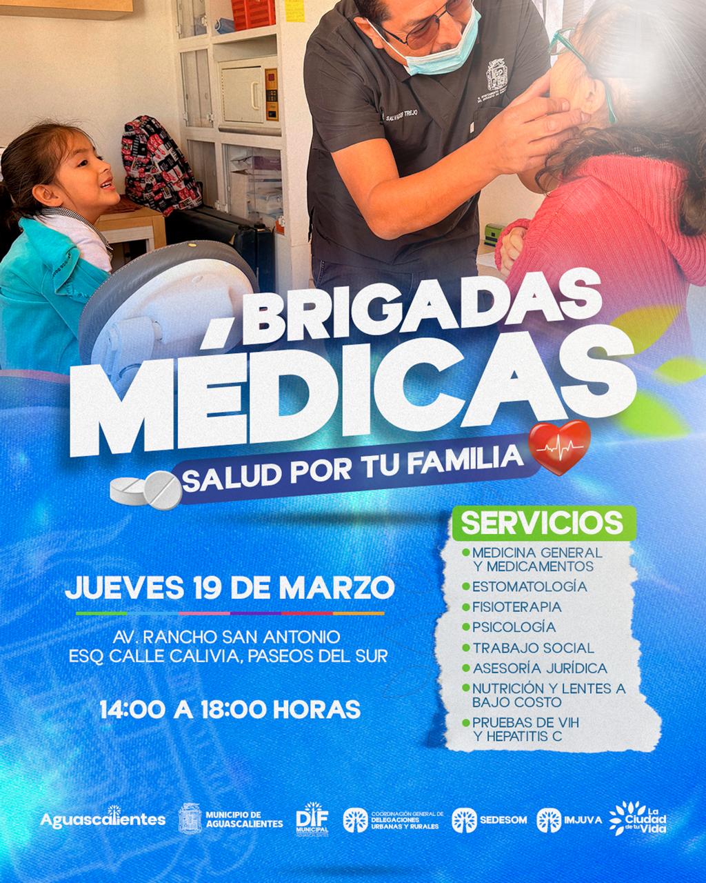 El Municipio de Aguascalientes, a través del DIF Municipal, invita a la ciudadanía a participar en las Brigadas Médicas gratuitas que se llevarán a cabo los días 17 y 19 de marzo en distintos puntos del municipio, con el objetivo de acercar servicios de salud a las familias.