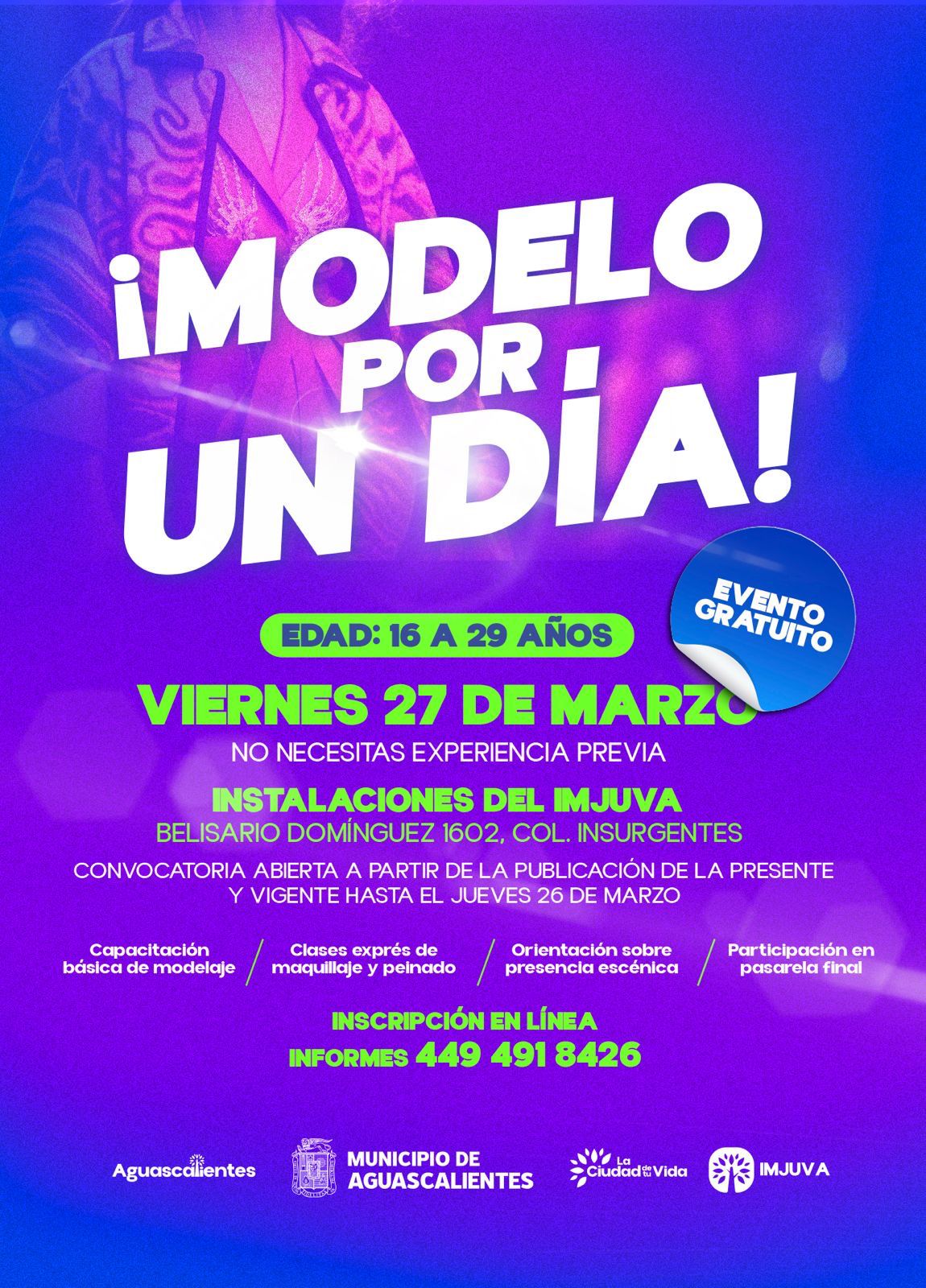 El Municipio de Aguascalientes, a través del Instituto Municipal de la Juventud, invita a las jóvenes a participar en la convocatoria “Modelo por un Día”, un evento realizado en el marco de la conmemoración del Mes de la Mujer, cuyo objetivo es impulsar la confianza, el desarrollo personal y la expresión de las juventudes.