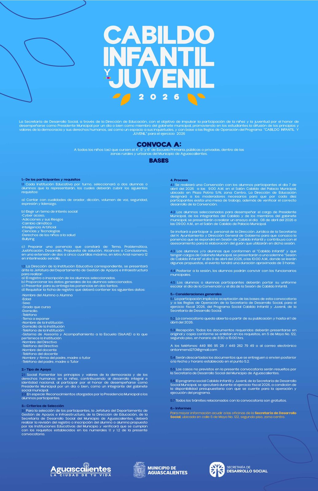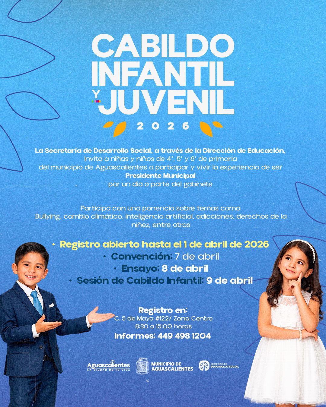 El Municipio de Aguascalientes, a través de la Secretaría de Desarrollo Social (SEDESOM), convoca a las niñas y niños que estén estudiando cuarto, quinto y sexto de primaria a participar en el programa “Cabildo Infantil y Juvenil”, en el que podrán desempeñarse como presidente municipal, síndicos, regidores y secretarios del gabinete municipal.