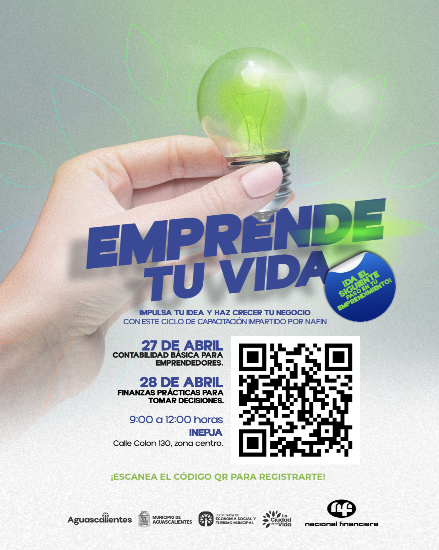 Con el objetivo de fortalecer las capacidades financieras de las y los emprendedores, el Municipio de Aguascalientes, a través de la Secretaría de Economía Social y Turismo Municipal (SETUM), en coordinación con Nacional Financiera (NAFIN), invita a participar en la capacitación “Contabilidad y Finanzas para Emprendedores” del ciclo de capacitaciones Emprende Tu Vida, que se llevará a cabo los días 27 y 28 de abril, en un horario de 9:00 a 13:00 horas, en las instalaciones del INEPJA, ubicadas en calle Colón 130, en la zona centro de la ciudad.
