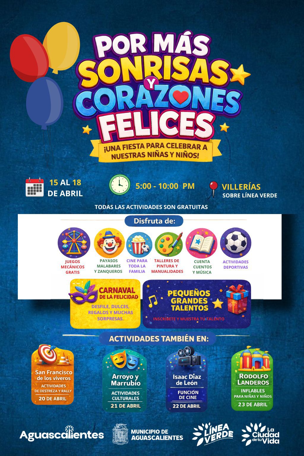 El Instituto de Convivencia y Desarrollo Línea Verde invita a todas las familias a disfrutar del evento “Por más sonrisas y corazones felices”, una gran celebración dedicada a niñas y niños, que se llevará a cabo del 15 al 18 de abril, en un horario de 5:00 a 10:00 de la tarde, en Villerías sobre Línea Verde.