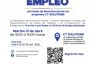 Con el objetivo de fortalecer las oportunidades laborales y acercar vacantes formales a la ciudadanía, la Secretaría de Economía Social y Turismo Municipal llevará a cabo la Segunda Jornada de Reclutamiento 2026 en coordinación con la empresa CT Solutions.