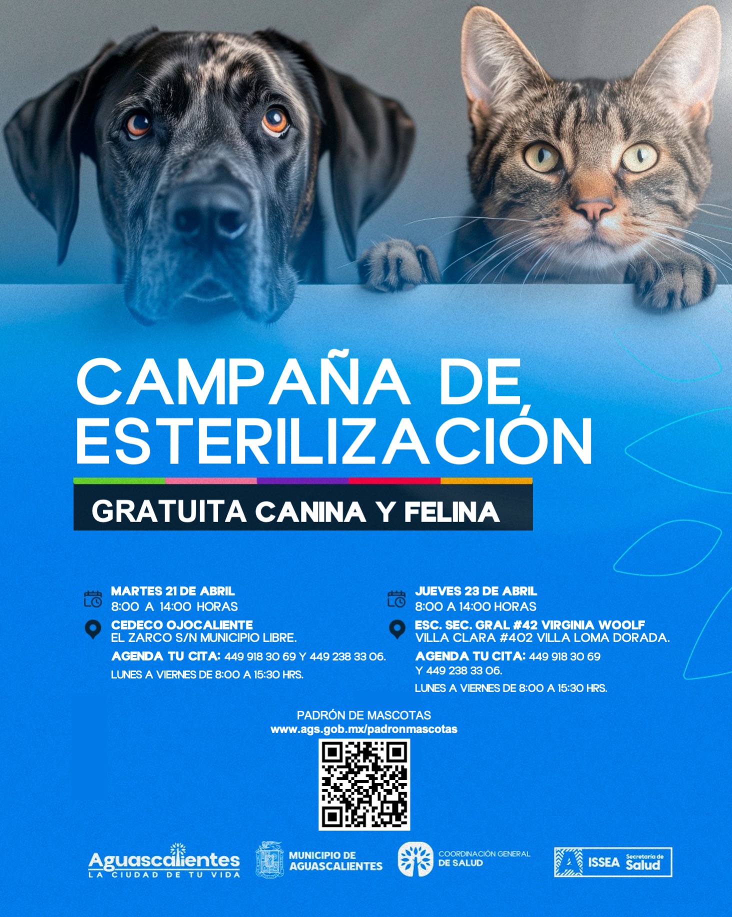 En cada sede se darán 50 lugares para esterilización que se agendarán solamente vía telefónica, será una cita por persona y en caso de no poder asistir se pide cancelar para dar espacio a otra mascota. Para agendar cita en ambos lugares están disponibles los teléfonos 449 918 30 69 y 449 238 33 06, de lunes a viernes de 8:00 a 15:30 horas.